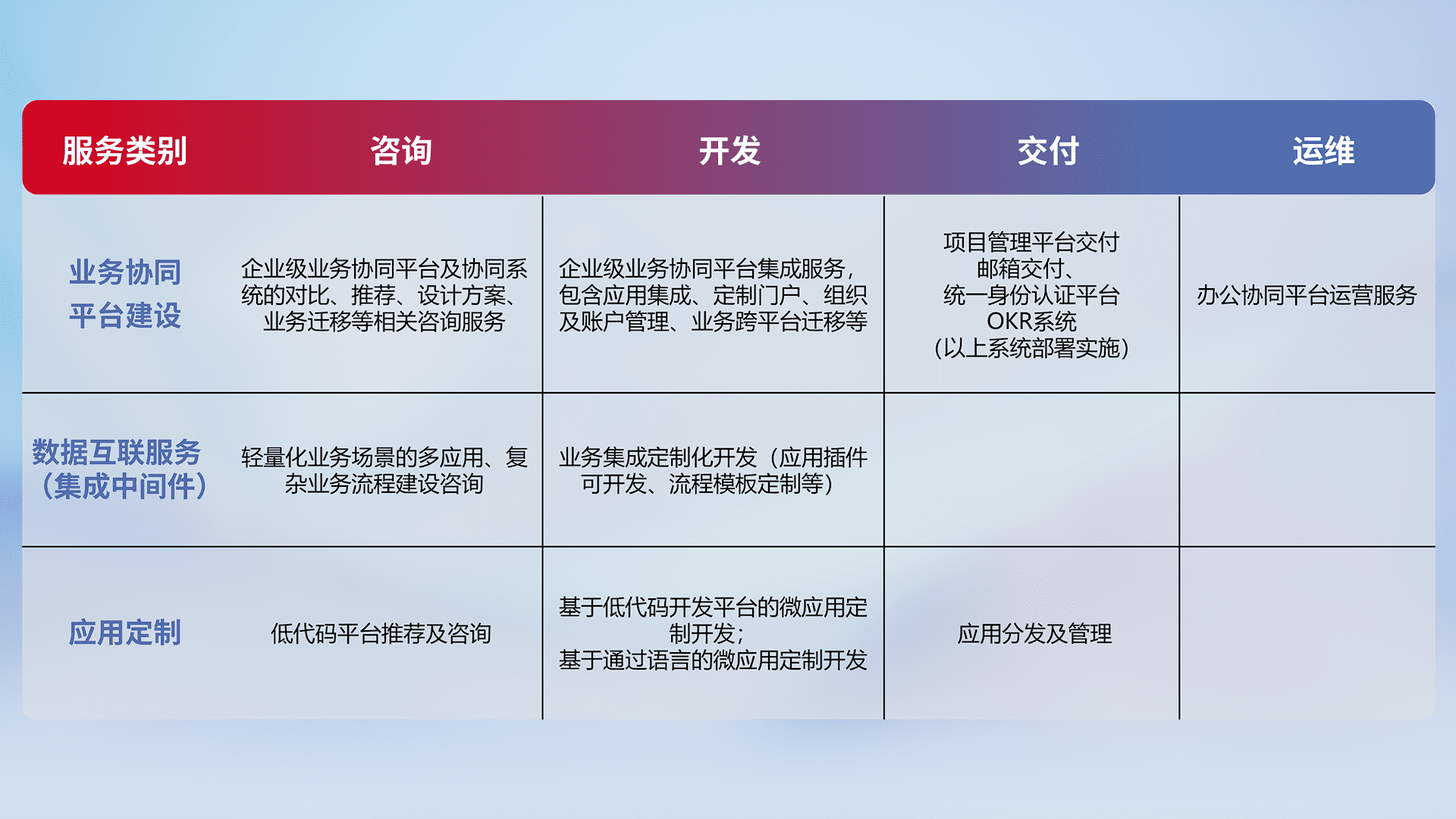 针对钉钉、、、企微、、IDaas等平台级产品提供产品的规划、、方案、、、交付、、定制化开发等服务,,,,实现如统一协同办公、、智能客户服务、、、、混合会议管理、、、智能数据查询、、、、等业务场景,,,,实现数字化转型。。
